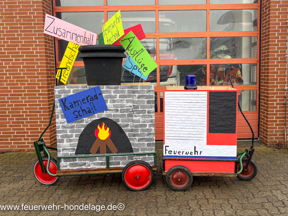 Bei den letzten Diensten wurden Handkarren passend zur Motto als Hexenkessel und Feuerwehrauto umgebaut. Die Jugendfeuerwehrkleidung wurden durch einen orangenen Zaubererumhang erweitert, ein passender Helm und vor allem ein Zauberstab durfte nicht fehlen. Dazu gab es für jeden einen Eimer mit Kamelle.